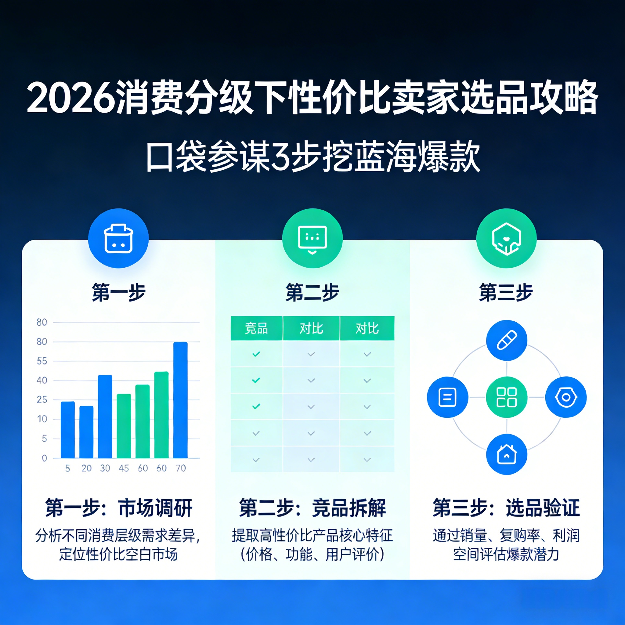 文章探讨2026年消费分级下,中小卖家如何通过口袋参谋工具选品,避开中端市场困境,专注极致性价比赛道。详细介绍了3步选品法:市场分析锁定蓝海类目、竞品监控找差异化机会、1688供应链匹配保证利润,并分享核心技巧如选择刚需高频品类和小单快反模式,帮助卖家提升爆款成功率,实现稳定盈利。